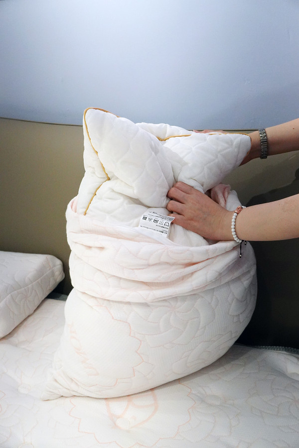 這顆枕頭跟市面上不一樣,它是用馬來西亞天然乳膠粒製成,不是一整塊的,而是像小球球一樣可以根據你的頭型、自重自動調節形狀,不管你是平躺、側睡、還是躺著滑手機,它都會自己塑形提供支撐。我試了真的覺得超紓壓!枕芯內部還有細緻的內裡布,觸感很好,連細節都沒馬虎。