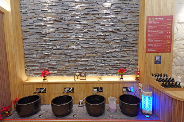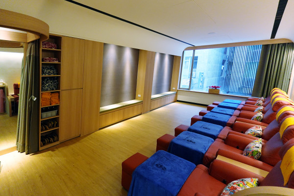 一樓有超放鬆的泡腳區,你可以一邊享受舒服泡腳一邊讓師傅舒緩緊繃的肩頸,旁邊的按摩座椅區底下也都有內嵌的泡腳盆,動線設計得非常流暢且貼心,還有提供WIFI跟插座。