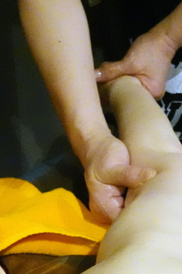 大腿的厚實肌肉在精油的輔助下被推開,小腿則是有種被釋放的輕盈感,師傅的手勁剛柔並濟,讓原本沉重如鉛的下半身,在推揉之間慢慢恢復了該有的彈性。