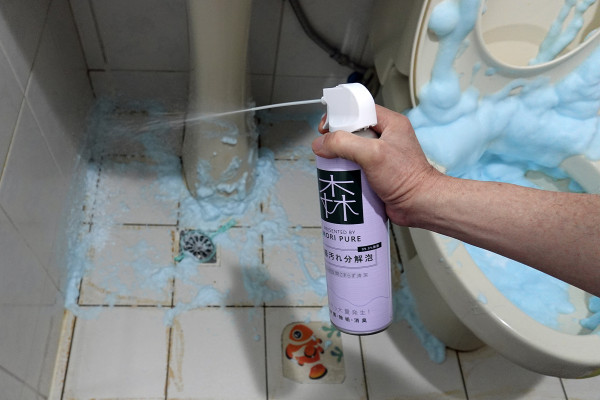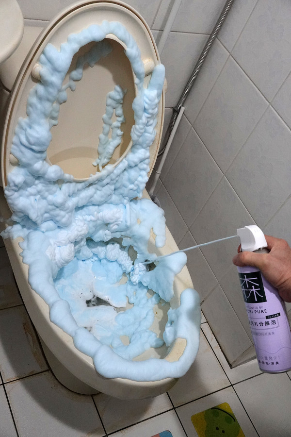 以前馬桶跟馬桶蓋都要拿刷子伸進去刷,刷到水花亂噴又很髒,現在只要噴一噴就好了。