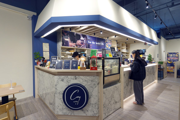 左側的大理石紋櫃檯搭配木質與藍色元素,加上精緻的品牌 Logo,完美展現了「Cozy」那種溫暖、簡單卻又不失格調的經營精神。這裡的工作區域開放且乾淨透明,看著店員專業地沖煮咖啡,那份安心感不言而喻。