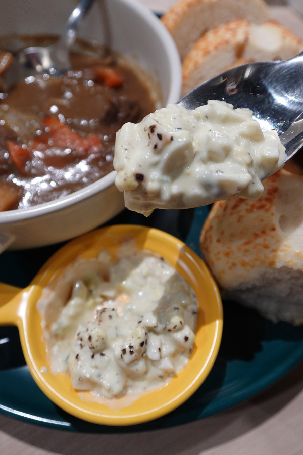 說到他們家的軟法麵包本身也很有特色,外皮帶著一點點細緻的咬勁,但內裡Q彈又綿密。如果試著先單吃會發現麵粉的純粹香氣伴隨著淡淡的奶味在口中越嚼越香、韌而不硬的絕佳比例,就算不沾任何醬汁,光是享受那種彈牙的咀嚼感就已經是一種享受了。