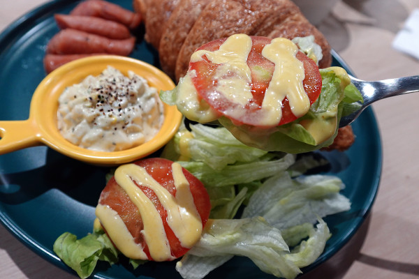 而旁邊的生菜沙拉除了新鮮綠葉,上面還鋪了鮮甜的番茄切片,淋上店家特製的酸甜醬料,吃起來既清爽又解膩,完美的平衡了拼盤的份量感。