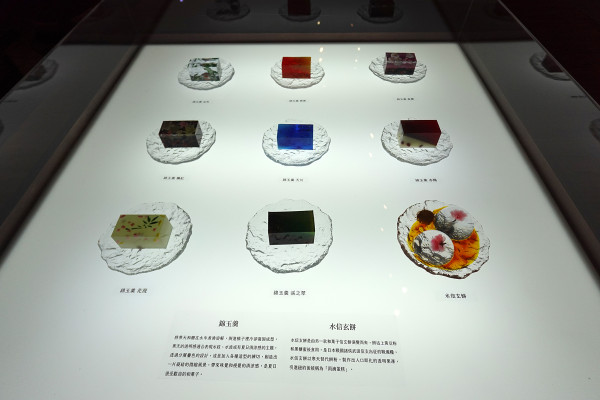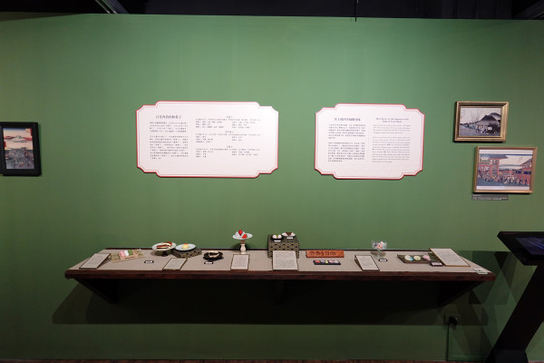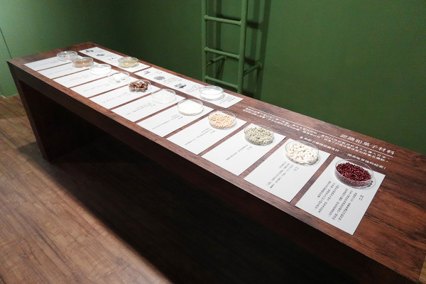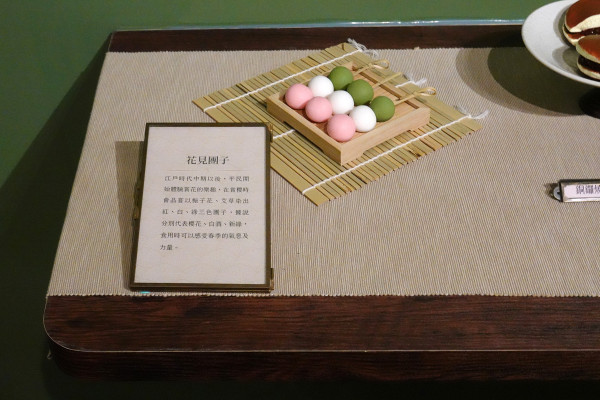 後方還有食材展示區,擺放了豆餡、求肥、寒天等原料。館方非常貼心,為了服務視障朋友,這個區塊特別開放「觸覺體驗」,讓大家能透過雙手直接感受製作和菓子的原始材料。