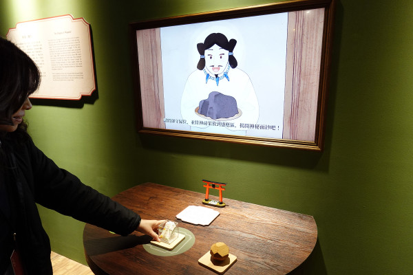 在這區有個超有趣的感應互動裝置,只要你拿起特製的御守或和菓子模型放在感應區,螢幕就會立刻跳出相關說明。