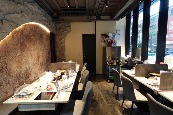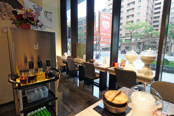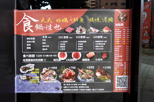 遠遠就能看到食鍋性也火鍋藝文店挑高大器的門面,灰色玻璃大門透出一種神祕又高級的質感,門口貼心地貼上菜單,讓路過的客人可以直接參考價位。每人的低消是 $359,會酌收10%服務費。