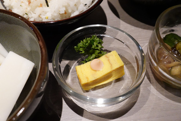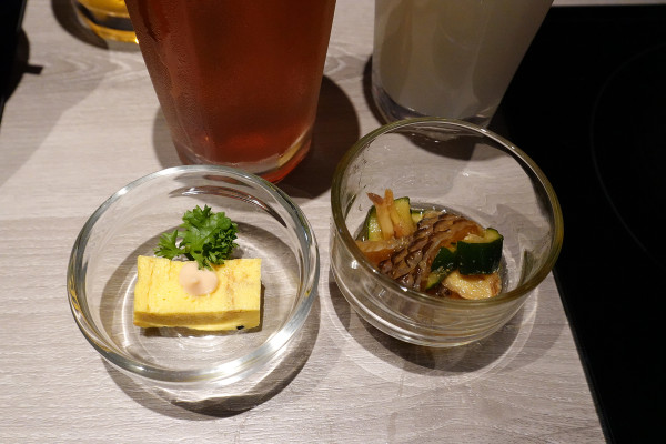 當天我們嚐到了裝在精緻透明小碟子裡的玉子燒佐龍蝦沙拉醬和小黃瓜涼拌魚皮。