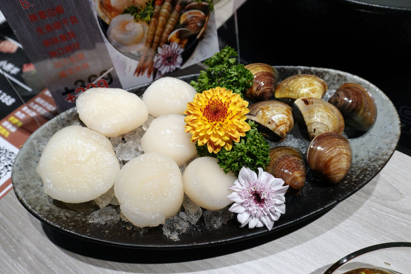 這份干貝並盛盤子上霸氣地排滿 6 顆圓潤飽滿的生食級大干貝,旁邊還擠滿了一大份分量十足的大蛤蠣,光是視覺上的純白與晶瑩感,就讓人感受到大海的誠意。