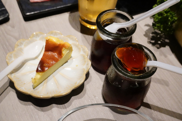 我們當天點了乳酪蛋糕跟黑糖茶凍。乳酪蛋糕看起來紮實有質感,入口後濃郁的奶香在嘴裡化開,口感綿密卻不甜膩;黑糖茶凍則是裝在小巧的容器裡,深褐色的凍體透著光澤,吃起來清爽滑口,帶著淡淡的黑糖焦香,為這餐畫下完美的句點。